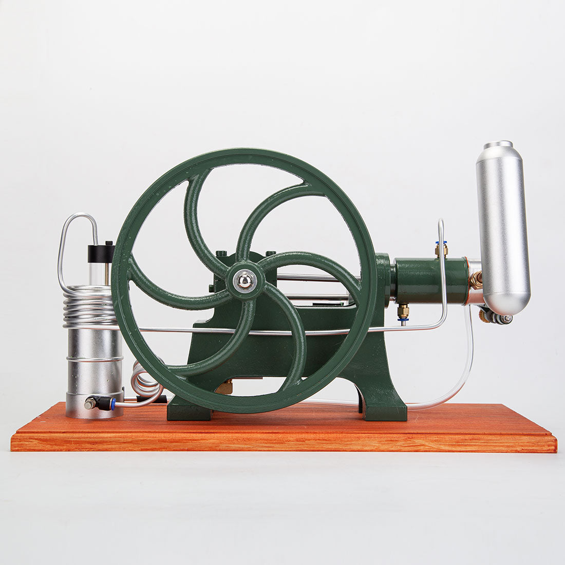 Inspired by the engines that appeared in Europe in the early 1900s, the horizontal four-stroke gas engine, with an extremely distinctive large cast iron flywheel, is made of a large number of cast iron castings and dark green paint treatment on the surface for more retro texture.